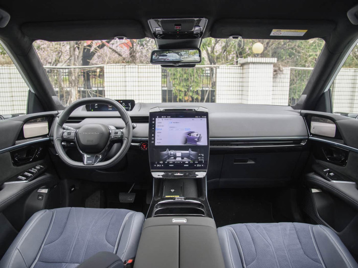 进入车内,内饰以 “数字流动” 为设计核心,12.8 英寸 + 10.25 英寸瀑布式防眩目液晶屏与 9.9 英寸全虚拟仪表、AR-HUD 形成三屏联动,阳光直射下仍能清晰显示信息。1.85㎡超大智能调光天幕支持 5 档调节,隔绝 99% 紫外线的同时,让座舱通透开阔。座椅采用三层零压感设计,仿麂皮材质抗菌指数超 6.0,配备智能加热系统,180cm 乘客坐入前排,背部贴合度与腿部支撑性堪称同级最优。后排腿部空间达两拳,地台纯平设计提升中间乘客舒适性,全车遍布 12 处储物空间,门板储物槽可容纳 1.5L水瓶,后备箱常规容积达520L,放倒后排后扩展至 1630L,满足露营装备等装载需求。